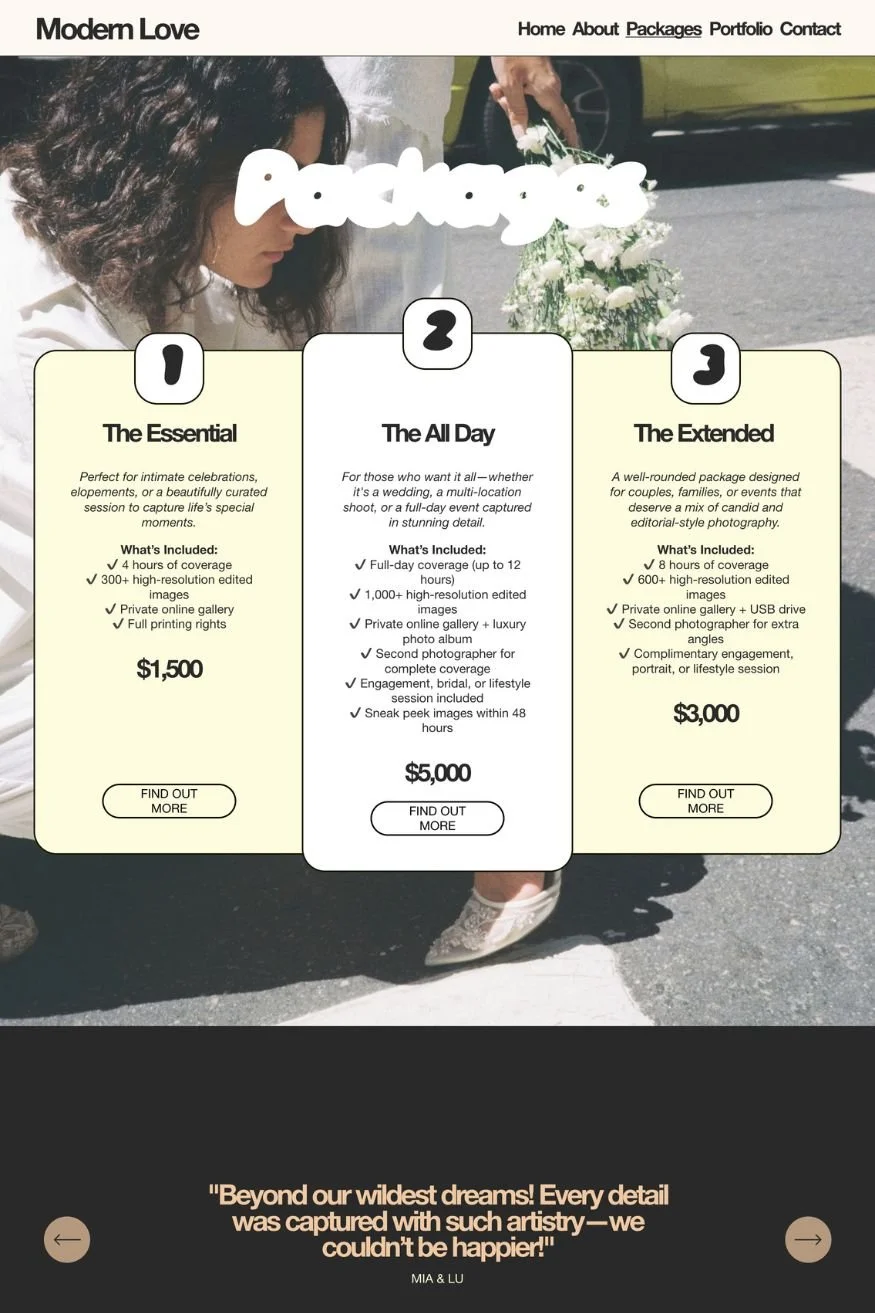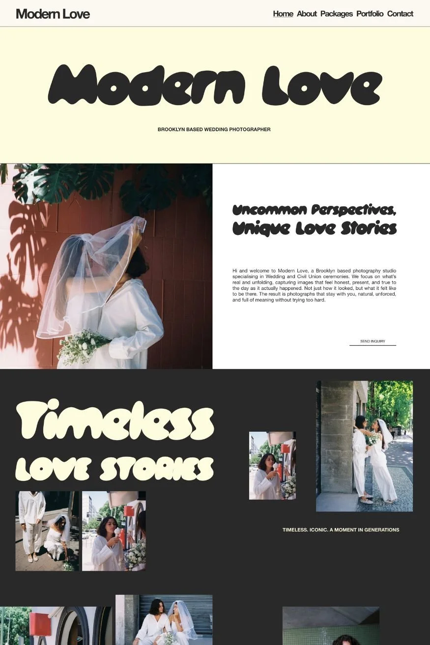 Clean, confident, and designed to let your work lead, Modern Love is created for photographers, stylists, and visual creatives who want their brand to feel modern, polished, and unmistakably professional.