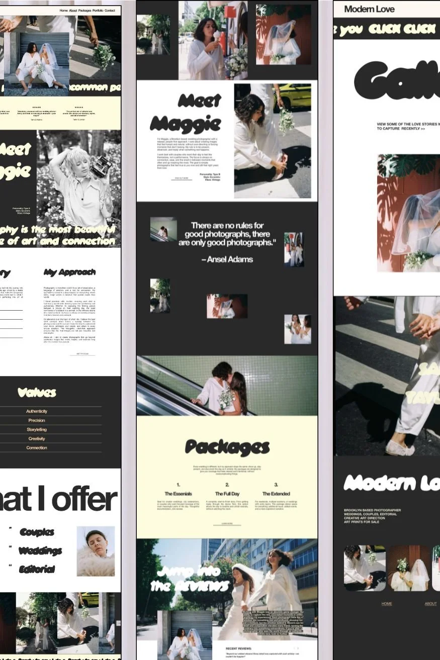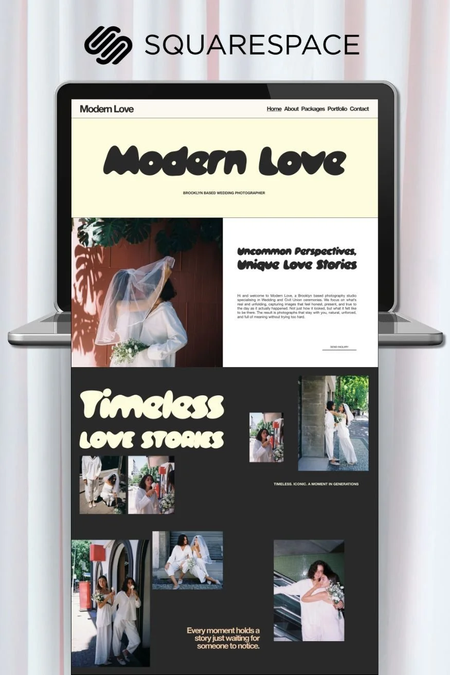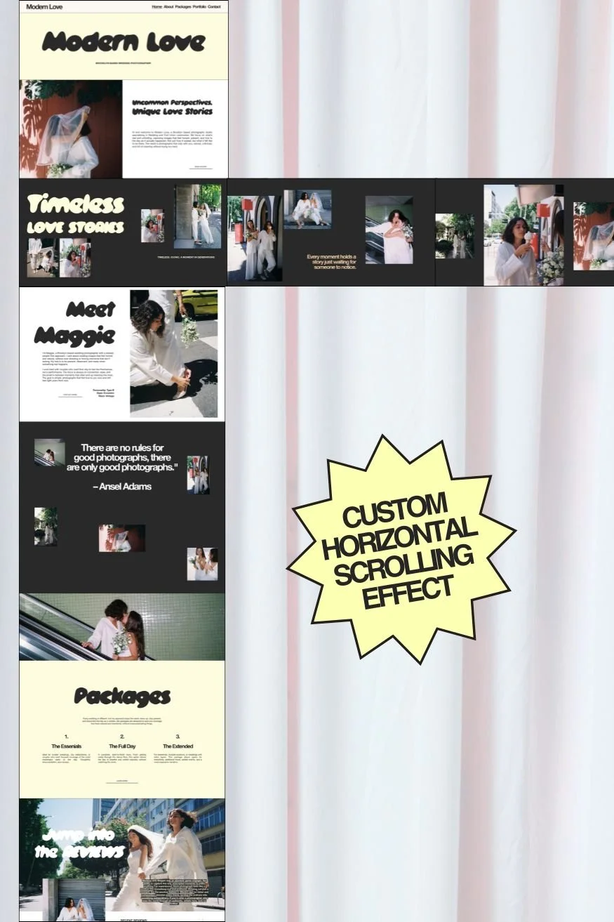 Modern Love is a clean, confident Squarespace SEMI CUSTOM template featuring a custom coded horizontal scroll for heightened visual engagement. Created for photographers, stylists, and visual creatives, Modern Love is designed to showcase your work with clarity and impact with image-led layouts, refined typography, and thoughtfully structured sections that highlight your portfolio and services with intention.